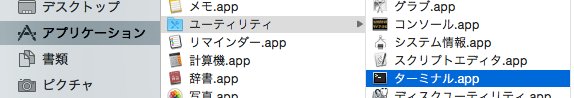 macのfinderより、「アプリケーション」から「ユーティリティ」、「ターミナル.app」を起動。