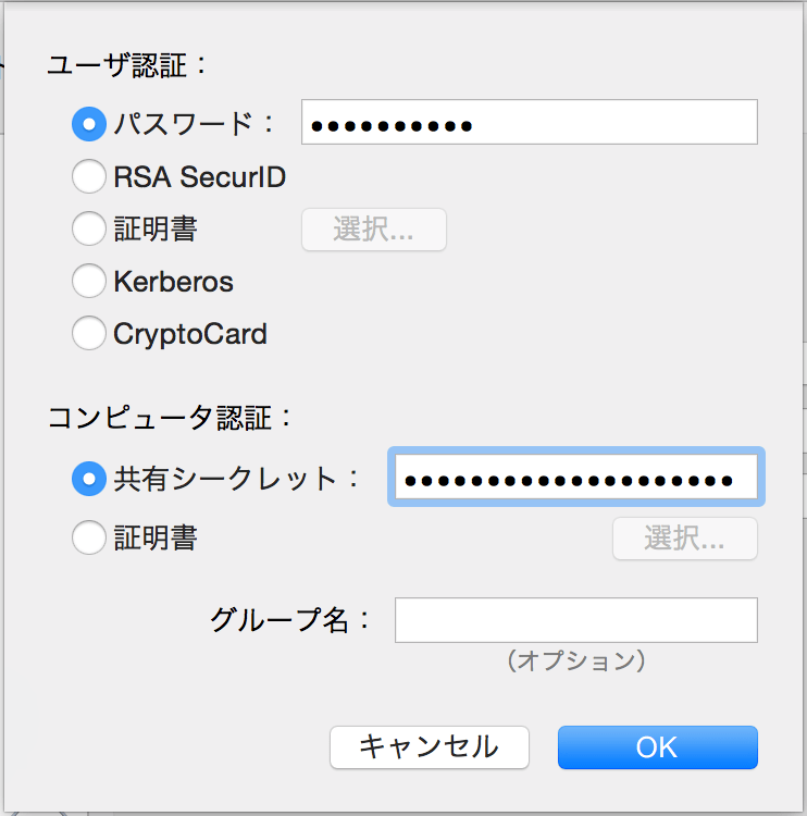 コンピューター認証の「共有シークレット」に「事前共有キー」を入力し、 OKをクリックして閉じます。